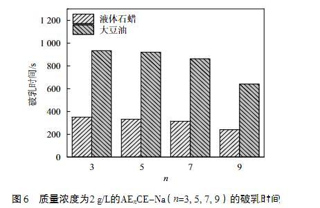 表面活性劑的另一大用途是通過降低油/水界面的界面張力而用作乳化劑,穩(wěn)定存在的乳液被廣泛應(yīng)用于食品、藥品和個人護(hù)理等方面。因此,測試了不同EO加合數(shù)的AEnCE-Na對大豆油和液體石蠟的破乳時間,結(jié)果如圖6所示。