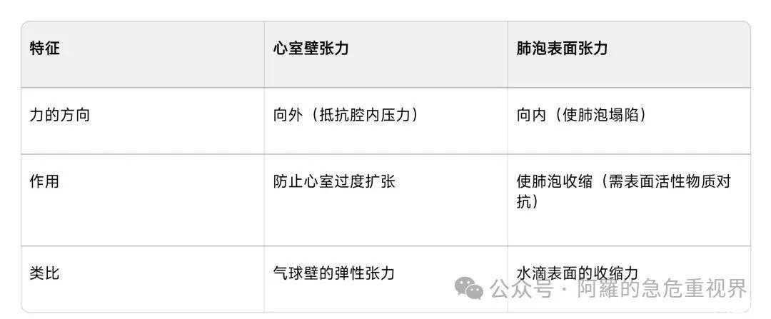 三、這兩種力的方向相反心室壁張力:把心臟想成一個氣球,心室壁張力就像氣球壁被里面的氣往外撐,方向是從里朝外、一圈圈地繞著球壁,幫助把血“擠”出去。肺泡表面張力:肺泡像極小的肥皂泡,表面張力就像肥皂膜總想把自己縮成最小,力的方向全是朝著泡中心,想把泡“掐”癟。一個向外推血,一個向內(nèi)掐泡。