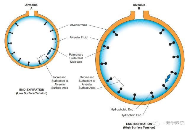 肺表面活性物質(zhì)(Pulmonary surfactant,PS)是由II型肺泡上皮細(xì)泡合成和分泌的一種磷脂蛋白混合物,由磷脂(約90%)和蛋白質(zhì)(約10%)組成。肺表面活性劑中主要的表面張力化學(xué)物質(zhì)是二棕櫚酰磷脂酰膽堿(Dipal mitoyl phosphatidylcholine,DPPC)。DPPC分子既有疏水(水不溶性)端,也有親水(水溶性)端。這種獨(dú)特的疏水/親水結(jié)構(gòu)使DPPC分子定位于肺泡氣液界面,使親水端朝向液相,疏水端朝向氣相。肺泡氣液界面的DPPC分子導(dǎo)致表面張力按其與肺泡表面積的比值成比例下降。當(dāng)肺泡尺寸減小(呼氣)時,DPPC占肺泡表面積的比例增加,從而增加DPPC分子的作用,并導(dǎo)致肺泡表面張力降低。相反,當(dāng)肺泡尺寸增加(吸入)時,DPPC相對于肺泡表面積的含量減少(因?yàn)楫?dāng)肺泡大小變化時表面活性劑分子的數(shù)量不變),從而降低DPPC分子的作用并導(dǎo)致肺泡表面張力增加。