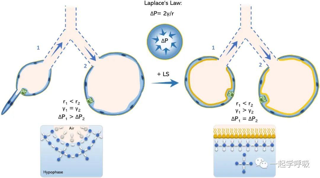 ▲肺泡Laplace定律的示意模型。理想球形肺泡的內(nèi)壓由Laplace定律定義為ΔP=2γ/r。因此,小半徑的肺泡(肺泡1)相對于大半徑的肺泡(肺泡2)具有更高的內(nèi)壓。在沒有功能性表面活性劑膜的情況下,肺泡1傾向于向肺泡2塌陷,這就允許了肺泡大小的不均勻性。然而,在表面活性劑的存在下,由于水-水-和水-空氣相之間均勻產(chǎn)生分子間力,避免了氣-液界面的彎曲并避免了肺泡塌陷,表面張力降低。LS是肺表面活性劑。