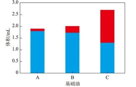 一般情況下,界面活性由小到大的順序?yàn)椋猴柡蜔N<芳烴<膠質(zhì)。重芳烴及膠質(zhì)組分中的極性物質(zhì)具有較強(qiáng)的界面活性,它們的存在可以降低油品與水的界面張力,使油品容易乳化。且復(fù)合劑的加入進(jìn)一步降低了油水的界面張力,導(dǎo)致油品乳狀液穩(wěn)定性增強(qiáng),其分水性變差。加入的復(fù)合劑可能與油品中所含芳烴和膠質(zhì)等極性化合物結(jié)合,導(dǎo)致基礎(chǔ)油分水性更差。所以基礎(chǔ)油中所含極性組分越多,其與加入的復(fù)合劑結(jié)合的程度就越強(qiáng),導(dǎo)致基礎(chǔ)油的分水性越差。結(jié)合表1進(jìn)行分析可知:基礎(chǔ)油A的黏度最小,且芳烴和膠質(zhì)等極性化合物含量最少,其分水性最好;基礎(chǔ)油C的黏度最大,且芳烴和膠質(zhì)等極性化合物含量最高,其分水性最差;基礎(chǔ)油B的黏度和極性組分含量比A大、比C小,其分水性能介于A與C之間。