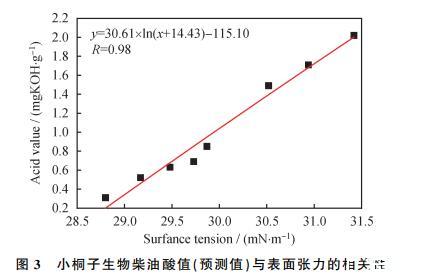 (2)通過(guò)氧化實(shí)驗(yàn)得到的小桐子生物柴油的酸值與表面張力相關(guān)系數(shù)為0.99,表明可用表面張力預(yù)測(cè)酸值;比較4種預(yù)測(cè)模型的精度分析結(jié)果,確定對(duì)數(shù)模型(y=30.61x ln(x+14.43)-115.10)精度最高,其預(yù)測(cè)均方根誤差REMSP值及相關(guān)系數(shù)R分別為0.0937和0.9879,酸值預(yù)測(cè)值與真實(shí)值誤差為2.95%。
