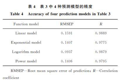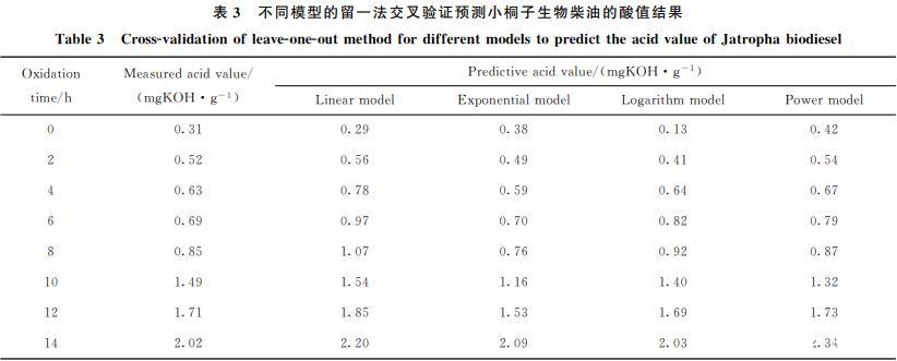留一法交叉驗(yàn)證是建立預(yù)測(cè)模型的一種常用方法,從N個(gè)觀測(cè)數(shù)據(jù)中選擇一個(gè)觀測(cè)數(shù)據(jù)作為驗(yàn)證數(shù)據(jù),然后使用剩下的(N-1)個(gè)觀測(cè)數(shù)據(jù)擬合一個(gè)模型,并用驗(yàn)證數(shù)據(jù)來(lái)驗(yàn)證模型的精度,如此重復(fù)N次??紤]到數(shù)據(jù)量以及相關(guān)性,筆者利用Excel建立了線性、指數(shù)、對(duì)數(shù)、乘冪4種預(yù)測(cè)模型,對(duì)小桐子生物柴油酸值的預(yù)測(cè)結(jié)果見(jiàn)表3。