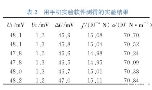利用改裝后的液體表面張力系數(shù)測(cè)量?jī)x和手機(jī)實(shí)驗(yàn)軟件記錄實(shí)驗(yàn)數(shù)據(jù),實(shí)驗(yàn)數(shù)據(jù)可在手機(jī)屏幕實(shí)時(shí)顯示,拖動(dòng)手機(jī)屏幕找到“拉斷液柱”時(shí)所對(duì)應(yīng)的數(shù)據(jù),測(cè)得的U1和U2數(shù)據(jù)如表2所示。
