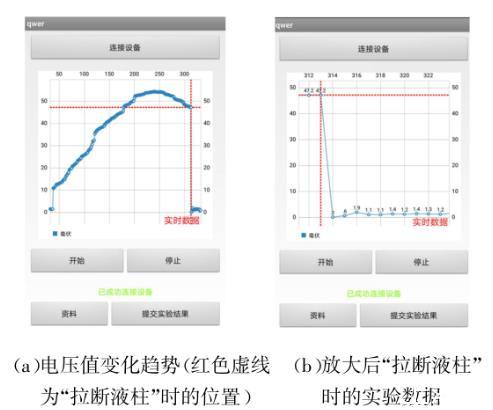 針對(duì)傳統(tǒng)實(shí)驗(yàn)?zāi)J街杏涗洈?shù)據(jù)的缺點(diǎn),在智能手機(jī)上開(kāi)發(fā)了專(zhuān)門(mén)的實(shí)驗(yàn)軟件,通過(guò)手機(jī)的藍(lán)牙連接到實(shí)驗(yàn)儀器,將實(shí)驗(yàn)所采集到的所有電壓表讀數(shù)實(shí)時(shí)傳送到智能手機(jī)上,然后在智能手機(jī)上以坐標(biāo)點(diǎn)的形式描繪出電壓表讀數(shù)的變化,在智能手機(jī)端就可以觀察到金屬環(huán)與液面分離瞬間的數(shù)據(jù)變化,很方便地讀取到“拉斷液柱”瞬間的實(shí)驗(yàn)數(shù)據(jù)。