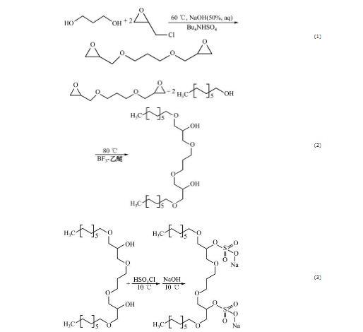材料有:1-十二烷醇C12H25OH,化學(xué)純,濟(jì)寧宏明化學(xué)試劑有限公司生產(chǎn);四丁基硫酸氫銨(TBAHS)Bu4NHSO4,分析純,天津致遠(yuǎn)化學(xué)試劑有限公司;1,3-丙二醇HOCH2CH2CH2OH,分析純,濟(jì)寧宏明化學(xué)試劑有限公司生產(chǎn);環(huán)氧氯丙烷C3H5ClO,化學(xué)純,濟(jì)寧宏明化學(xué)試劑有限公司生產(chǎn);氫氧化鈉NaOH,分析純,濟(jì)寧宏明化學(xué)試劑有限公司生產(chǎn);無水乙醇C?H?OH,化學(xué)純,濟(jì)寧宏明化學(xué)試劑有限公司生產(chǎn);BF3-乙醚溶液,北京化工廠生產(chǎn);氯磺酸HSO3Cl,化學(xué)純,成都化夏化學(xué)試劑有限公司生產(chǎn);去離子水,分析純,實(shí)驗(yàn)室自制。