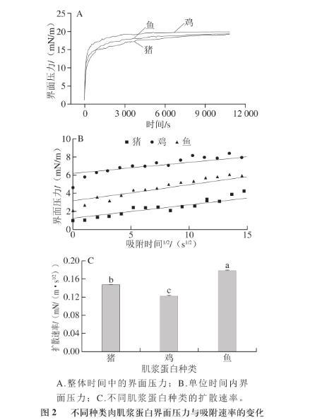 由圖2可知,不同種類肌漿蛋白的動(dòng)力學(xué)擴(kuò)散速率間存在差異性。蛋白質(zhì)分子在界面上的擴(kuò)散速率受其粒徑大小的影響,而本實(shí)驗(yàn)結(jié)果更能解釋這一現(xiàn)象。在前述理化指標(biāo)中,粒徑大小為雞肉肌漿蛋白>豬肉肌漿蛋白>魚(yú)肉肌漿蛋白,而在本部分?jǐn)U散速率大小為雞肉肌漿蛋白<豬肉肌漿蛋白<魚(yú)肉肌漿蛋白。這可能是由于大粒徑的肌漿蛋白產(chǎn)生的空間位阻在一定程度上削弱了表面疏水性提高帶來(lái)的吸附速率增加。而且魚(yú)肉肌漿蛋白的擴(kuò)散速率較豬肉和雞肉肌漿蛋白間顯著較大(P<0.05),但雞肉與豬肉肌漿蛋白之間的擴(kuò)散速率卻無(wú)顯著性差異(P>0.05)。