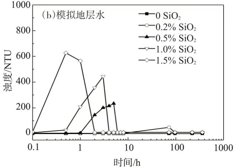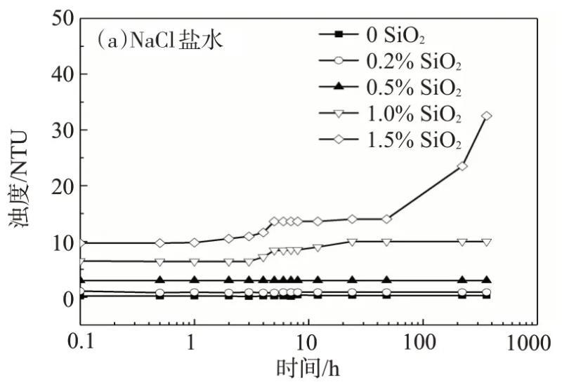 用模擬地層水配制的納米SiO2/SDS體系經(jīng)歷了澄清透明-渾濁-沉降的3個階段,靜置初始,納米SiO2質(zhì)量分?jǐn)?shù)為0.5%的體系的濁度不隨時間的延長而變化,表明此時體系穩(wěn)定;靜置1 h后,濁度明顯增加;靜置6 h后,體系的濁度又恢復(fù)到了初始值,由于實驗測試的是樣品上半部分的濁度,說明此時體系已經(jīng)完全沉降。