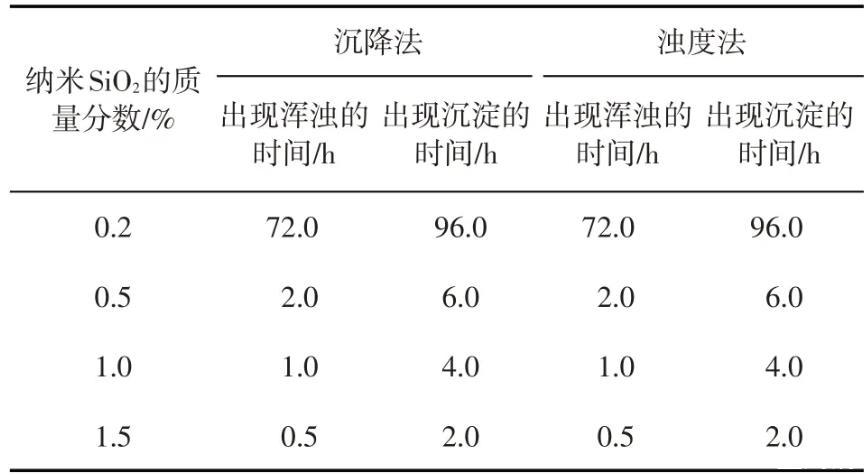 表1模擬地層水中納米SiO2/SDS體系出現(xiàn)渾濁、沉淀的時間(SDS質(zhì)量分?jǐn)?shù)為0.3%)
