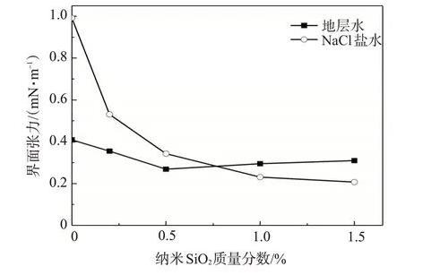 在NaCl鹽水中,納米SiO2/SDS體系的|ζ|基本大于30 mV,體系更易穩(wěn)定;模擬地層水中二價陽離子的存在使得體系的|ζ|均小于30 mV,顆粒容易聚集沉淀。納米SiO2含量越大,顆粒之間碰撞的機率增加,納米SiO2/SDS體系的穩(wěn)定性越差。隨著納米SiO2含量的增加,SDS降低油水界面張力的能力在NaCl鹽水中逐漸增強,而在模擬地層水中先增后減,在SiO2質量分數為0.5%時界面張力達到最低。