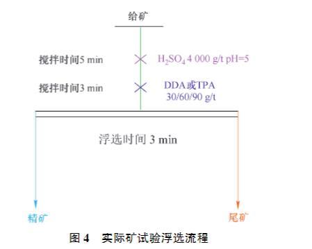 在XFG掛槽浮選機上進行實際礦浮選試驗,轉(zhuǎn)速設為1 992 r/min。每次稱取250.0 g礦樣放入0.5 L浮選槽中,加入0.3 L自來水;綜合考量文獻調(diào)研、純礦物浮選結(jié)果、經(jīng)濟性等方面因素,確定礦漿pH值等于5為較佳的浮選pH條件。使用H?SO?作為pH調(diào)整劑,調(diào)節(jié)礦漿pH值為5,攪拌礦漿5 min后,加入一定量的DDA或TPA,攪拌3 min后開始用刮板刮出泡沫產(chǎn)品,每間隔3 s刮1次,浮選刮泡時間為3 min。結(jié)束后將得到的泡沫產(chǎn)品和槽內(nèi)產(chǎn)品分別烘干、稱量,測定品位,并計算產(chǎn)率與回收率。實際礦浮選試驗流程如圖4所示。