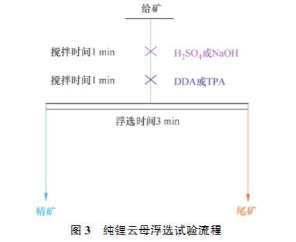 在XFG掛槽浮選機上進行純礦物浮選試驗,轉(zhuǎn)速設為1 992 r/min。每次稱取2.00 g純礦物放入50 mL浮選槽中,然后加入40 mL超純水,用H?SO?或NaOH調(diào)節(jié)pH值,攪拌礦漿1 min,加入一定量DDA或TPA,攪拌1 min,保持充氣量恒定,充氣1 min,用刮板刮出泡沫產(chǎn)品,每間隔3 s刮1次,浮選刮泡時間為3 min。結(jié)束后將得到的泡沫產(chǎn)品(精礦)和槽內(nèi)產(chǎn)品(尾礦)分別烘干、稱量、計算回收率。進行浮選pH及濃度試驗時,每組試驗設置1個平行試驗,并對浮選結(jié)果求平均值。純礦物浮選試驗流程如圖3所示。
