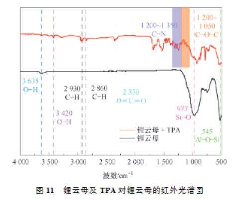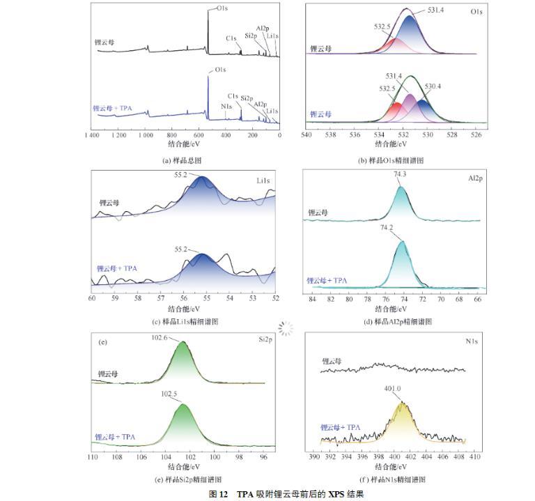 (2)接觸角試驗(yàn)表明,同等條件下,TPA作用鋰云母的接觸角總是大于DDA,展現(xiàn)了TPA更強(qiáng)的疏水性。Zeta電位測試結(jié)果表明,TPA及DDA在鋰云母表面的吸附為靜電吸附,并且碳鏈更長的TPA由于疏水效應(yīng)吸附性更好,進(jìn)一步證明了TPA的強(qiáng)疏水性。FTIR及XPS進(jìn)一步證實(shí)了TPA吸附在鋰云母表面。