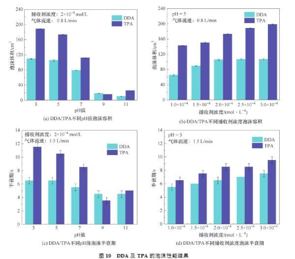 (3)在不同濃度下,TPA均得到比DDA更低的表面張力,說明TPA可能具有更多的泡沫容積,泡沫容積結(jié)果驗(yàn)證了表面張力結(jié)果。在不同濃度下,TPA均得到比DDA更高的黏度,說明TPA產(chǎn)生的泡沫更穩(wěn)定,泡沫半衰期結(jié)果驗(yàn)證了黏度結(jié)果。表面張力試驗(yàn)、黏度試驗(yàn)、泡沫容積試驗(yàn)、泡沫半衰期試驗(yàn)共同證明TPA更優(yōu)越的泡沫性能。將TPA應(yīng)用于浮選中,能夠增大氣泡與鋰云母的碰撞及接觸概率,增強(qiáng)鋰云母與氣泡的黏附,減少鋰云母與氣泡的脫附,進(jìn)而提高浮選回收率。