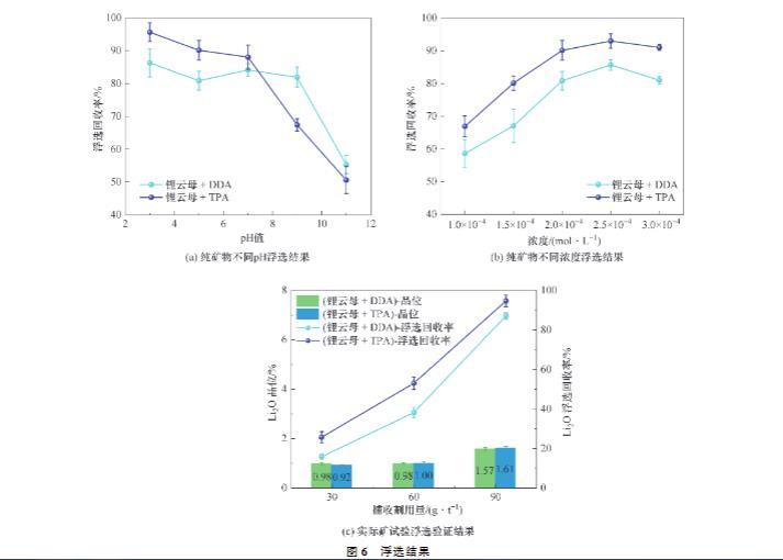 實(shí)際礦浮選試驗(yàn)的檢測結(jié)果如圖6(c)所示,可以看出,在較小的捕收劑用量下,TPA或DDA作用后鋰云母精礦的品位相接近。但是,較高的產(chǎn)率使得TPA對鋰云母的浮選回收率高于DDA。實(shí)際礦檢測結(jié)果進(jìn)一步證明TPA浮選性能的優(yōu)越。此外,隨著藥劑用量的加大,DDA或TPA作用鋰云母的品位與回收率均會相應(yīng)提高。