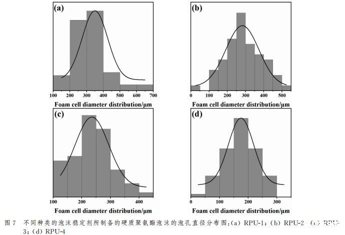為了對聚氨酯泡沫孔徑大小和分布情況進行量化,通過ImageJ軟件對SEM測試結果進行處理分析,其孔徑分布直方圖如圖7所示。通過泡沫的孔徑分布直方圖對比結果可以看出,添加國產-1的聚氨酯泡沫孔徑分布范圍在100~700μm,存在較大直徑的泡孔,添加進口-2的聚氨酯泡沫泡孔直徑分布范圍在0~550μm,雖然分布范圍有變窄,但也存在較大泡孔直徑,添加PAVE-5的聚氨酯泡沫泡孔直徑分布范圍在100~450μm,泡孔分布范圍減小,但仍然存在超過400μm的大泡孔,分布范圍最窄的是添加PGVF-6泡沫穩(wěn)定劑的硬質聚氨酯泡沫,分布范圍在0~300μm,沒有超過400μm直徑的泡孔,泡沫泡孔直徑得以減小,泡沫泡孔細小均勻。這種微觀結構上的改善可能得益于在發(fā)泡過程中,接枝APEG的POSS可以作為三維網(wǎng)絡結構的交聯(lián)點,通過其與聚氨酯基體的相容性,親水性-OH基團有助于形成更加穩(wěn)定的泡沫結構。