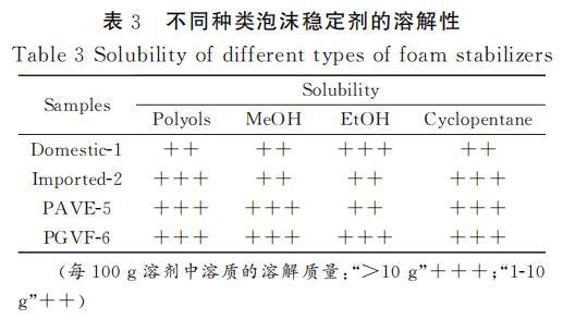 聚氨酯發(fā)泡過程中,各原料之間的相容性對泡沫的性能有重要影響。相容性好的原料可以確保發(fā)泡過程中的化學反應順利且充分進行,從而獲得均勻、細膩的泡沫結構,提高泡沫的物理性能和使用性能。表3是不同種類泡沫穩(wěn)定劑在不同溶劑中的溶解性測試,通過測試結果可知,經(jīng)過接枝改性后的PAVE-5和PGVF-6在多元醇和環(huán)戊烷中的溶解性較好,和國產-1、進口-2等泡沫穩(wěn)定劑都能夠很好的溶解在多元醇和環(huán)戊烷中。PGVF-6和PAVE-5在多元醇中表現(xiàn)出的優(yōu)良溶解性主要得益于POSS接枝的APEG鏈段的醚鍵和羥基都具有明顯的極性,這使得其分子間以及與其他極性分子間可以形成較強的極性相互作用。這種相互作用有助于分子間的相容性,對聚氨酯泡沫的形成和性能有積極作用。