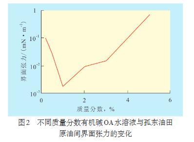 由水溶性好且不易揮發(fā)的有機堿OA水溶液在不同質(zhì)量分數(shù)時與孤東油田原油之間界面張力的關(guān)系可以看出,當有機堿OA水溶液質(zhì)量分數(shù)為0.1%~1.0%時,界面張力隨有機堿OA水溶液質(zhì)量分數(shù)的增加迅速下降,當有機堿OA質(zhì)量分數(shù)超過1.0%后,界面張力逐漸升高。表明有機堿OA水溶液與孤東油田原油作用可降低界面張力,且最佳的有機堿OA水溶液質(zhì)量分數(shù)為1.0%。