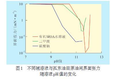 由不同pH值的碳酸鈉、三甲胺、有機堿OA水溶液與孤東油田原油之間界面張力的關(guān)系可見,無機堿和有機堿均可使孤東油田原油界面張力降低。當碳酸鈉溶液的pH值高于9時,其與原油的界面張力隨著pH值的升高而降低;當碳酸鈉溶液的pH值大于11時,其與原油的界面張力幾乎不再變化;當三甲胺和有機堿OA水溶液的pH值分別達到10和10.5后,其與原油的界面張力隨pH值升高先降低后升高,這是有機堿不同于無機堿的特點。