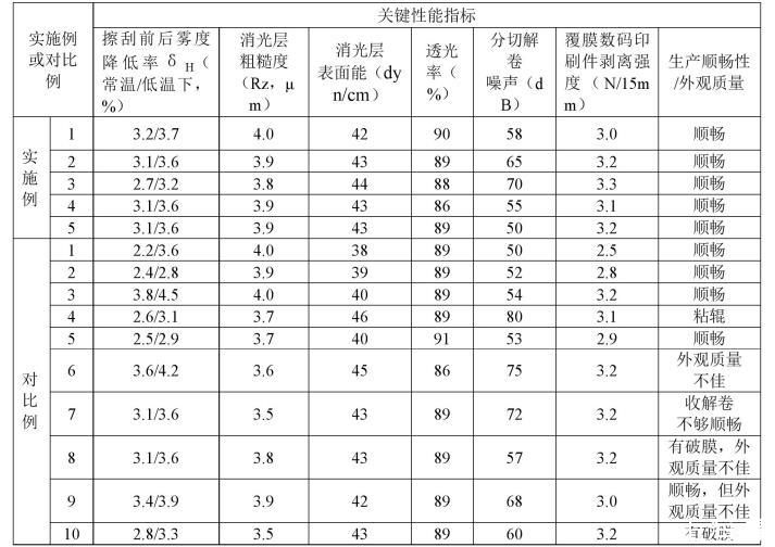 從實施例1~實施例5的數(shù)據(jù)可知,本發(fā)明的耐擦刮無膠消光膜在常溫和低溫環(huán)境下均具有良好的耐擦刮性能,實現(xiàn)了消光層表面在耐擦刮性、高表面張力(與印刷適性正相關(guān))與收解卷順暢性的平衡。其中實施例4中球體抗粘連劑為球體聚硅氧烷,雖然制得的薄膜的透光率相比實施例2有所下降,但是薄膜的分切解卷噪聲降低明顯,總體性能是符合本申請要達到的目標的。實施例5中,在熱復合層中加入了適宜熔融指數(shù)的高密度聚乙烯,其制備的耐擦刮無膠消光膜表現(xiàn)出更低的分切解卷噪聲,解卷順暢性更好,且未對薄膜的透光率和熱復合層與印刷件之間的剝離強度產(chǎn)生不良影響。
