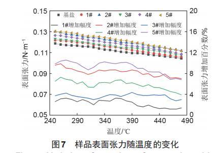 樣品的表面張力值隨溫度變化如圖7所示??梢钥吹剑?50~480℃內(nèi),基鹽的表面張力在0.1044~0.1188N/m,表面張力隨溫度的升高呈下降趨勢。1#納米熔鹽的表面張力在0.1059~0.1219N/m,對數(shù)據(jù)進(jìn)行擬合后,擬合系數(shù)在0.995以上,擬合程度較好。2#納米熔鹽的表面張力在0.1117~0.1301N/m,擬合系數(shù)為0.996,隨溫度變化的趨勢和基鹽及一般熔鹽表面張力的變化趨勢保持一致,均隨溫度的升高呈下降趨勢。3#和4#納米熔鹽的表面張力在0.1075~0.1232 N/m和0.1085~0.1265 N/m,擬合系數(shù)都在0.994以上,其中4#納米熔鹽的擬合系數(shù)與2#納米熔鹽的擬合系數(shù)相同,均為0.996,擬合程度最好。5#納米熔鹽的表面張力在0.1115~0.1305N/m,擬合系數(shù)為0.991。