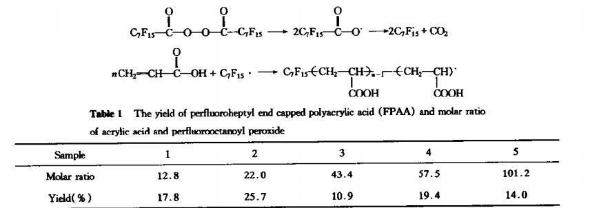 聚合反應(yīng)是在溶劑CF_{2}CICF CI_{2}中進(jìn)行的,大自由基將進(jìn)行鏈轉(zhuǎn)移,單基或雙基終止反應(yīng),從而得出產(chǎn)物。反應(yīng)步驟為在-17℃溫度下將50mL含有預(yù)定摩爾的全氟庚雙酰過氧化物的CF?CICFCI?溶液加入有氮?dú)獗Wo(hù)裝置的反應(yīng)器中,攪拌下加入已精制過的丙烯酸(密度1.0511g/mL),加熱并恒溫在45℃下反應(yīng)10h,產(chǎn)物通過甲醇-乙酸乙酯溶劑體系重結(jié)晶并置真空烘箱中干燥,稱重并計(jì)算產(chǎn)率(如表1)。