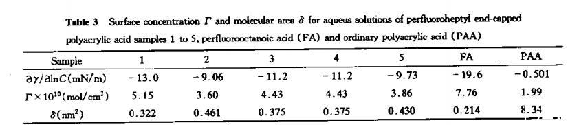 由表3可見,聚丙烯酸(分子量2.5x10?)在水溶液中界面活性極低(數(shù)據(jù)引自文獻(xiàn)),每個(gè)PAA分子對空氣-水界面的覆蓋十分松散,全氟庚酸分子所占約0.21nm2,接近全氟烷烴緊密排列的分子軸截面積,而FPAA每個(gè)分子所占據(jù)的表面面積在0.32~0.46nm2之間,形成尾形鏈構(gòu)象的刷狀結(jié)構(gòu)。全氟端基的引入,顯著改變了PAA分子在界面的構(gòu)象,由于全氟烴的憎水特性,在水溶液中趨于向水空氣界面的吸附,從而極大的提高了界面活性,降低了界面能。