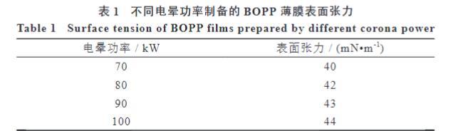 電暈功率的變化引起了BOPP薄膜表面化學(xué)組成的變化,會(huì)進(jìn)一步導(dǎo)致BOPP薄膜表面張力的改變。為了考察電暈功率對BOPP薄膜表面張力的具體影響規(guī)律,測試了在47℃預(yù)熱溫度條件下用不同電暈功率制備的BOPP薄膜剛下線時(shí)的表面張力,結(jié)果見表1。