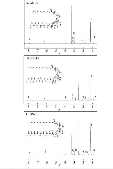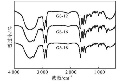 根據(jù)方案1的合成路線,成功制備了3種以1,4-二溴-2-丁烯為連接基團(tuán)的酰胺基Gemini表面活性劑。利用紅外和核磁對(duì)酰胺基Gemini表面活性劑GS-12,GS-16,GS-18進(jìn)行結(jié)構(gòu)表征,結(jié)果見圖1和圖2。