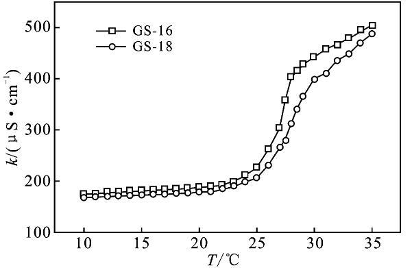 2.2.1 Krafft溫度Krafft溫度影響表面活性劑溶解度,表面活性劑在此溫度以上可以形成膠束。在Krafft溫度以下,以單分散的表面活性劑與水化固體表面活性劑的狀態(tài)存在,而在Krafft溫度以上,水化固體表面活性劑的溶解和膠束形成也參與了平衡[9-10]。質(zhì)量分?jǐn)?shù)1%表面活性劑GS-12,在室溫可以完全溶解,將其溶液置于冰水混合物中1周,溶液仍然澄清透明,沒有渾濁的跡象。表明GS-12的Krafft溫度低于0℃。通過(guò)測(cè)量電導(dǎo)率可以得到Krafft溫度的近似值,由圖3可知,GS-16,GS-18的Krafft溫度分別為27,27.5℃。k值在較低溫度下緩慢增加,這是由于離子表面活性劑的溶解度有限。隨著溫度的進(jìn)一步升高,Krafft溫度處的k值急劇增加。k值的增加是由于膠束的形成,水合表面活性劑的溶解度突然增加,直至達(dá)到克拉夫特溫度。此外,離子遷移率增加隨著溫度增加、k逐漸增加[3,10]。結(jié)果表明,Gemini表面活性劑的Krafft溫度隨表面活性劑的疏水鏈長(zhǎng)的增加而升高。