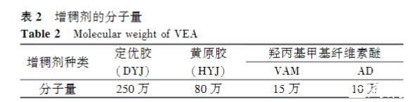 本工作采用多種增稠劑對(duì)砂漿的黏度進(jìn)行調(diào)整,分別為天然植物多糖類增稠劑(定優(yōu)膠和黃原膠)和合成纖維素醚類增稠劑(羥丙基甲基纖維素醚)兩大類,各自的分子量列于表2中。