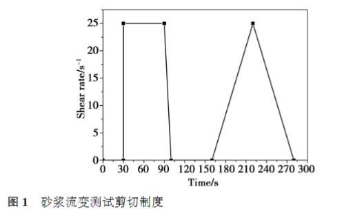 砂漿的流變測(cè)試使用Brookfield R/S SST2000流變儀,將測(cè)試流動(dòng)度之后的砂漿立即置于流變儀中,選定設(shè)置好的剪切制度后開(kāi)始測(cè)試,剪切制度設(shè)置如圖1所示。具體過(guò)程描述如下:靜置30s后,在剪切速率25s?1下勻速預(yù)剪切60s;然后剪切速率在10s內(nèi)勻速下降至0s?1;靜置60s后,剪切速率以斜坡式在60s內(nèi)逐漸從0s?1提高至25s?1,然后再以斜坡式在60s從25s?1下降到0,采集60個(gè)數(shù)據(jù)點(diǎn)。采用剪切速率從25s?1下降到0s?1的過(guò)程中的屈服應(yīng)力和表觀黏度作為分析砂漿流變性能的數(shù)據(jù)。