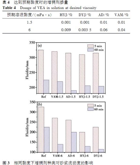 增稠劑溶液的黏度越高,砂漿的流動度越低。在較低黏度下,四種增稠劑對砂漿初始流動度的影響接近,60min時,AD的經(jīng)時流動度最低,VAM流動度相對于基準(zhǔn)砂漿略微下降;然而當(dāng)溶液黏度提高至6mPa·s時,摻入HYJ和DYJ的砂漿流動度顯著低于AD和VAM,60min后的損失也更大,AD的經(jīng)時流動度略低于基準(zhǔn)砂漿。