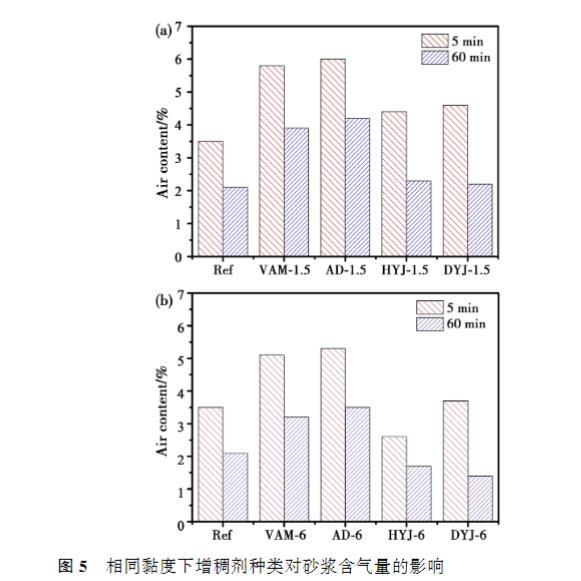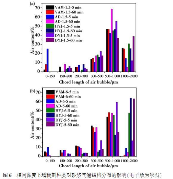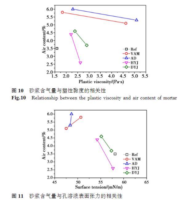 當(dāng)溶液黏度為1.5mPa·s時,VAM和AD的摻入使砂漿初始含氣量相對于基準(zhǔn)砂漿增大66%和71%,而HYJ和DYJ僅使初始含氣量提高26%和31%;當(dāng)溶液黏度為6mPa·s時,VAM和AD的摻入使砂漿初始含氣量相對于基準(zhǔn)砂漿增大46%和51%,而DYJ僅使初始含氣量提高6%,HYJ則降低含氣量26%.