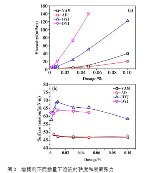 相同摻量下,DYJ的黏度最高,其次是HYJ,VAM和AD黏度在低摻量下接近,摻量達(dá)到0.10%之后,VAM黏度高于AD;VAM和AD的黏度隨著摻量的提高緩慢增大,而HYJ和DYJ溶液的黏度隨摻量的提高迅速提高,尤其是DYJ的增長幅度更為顯著??傮w來看,增稠劑分子量越大,相同摻量時溶液的黏度越高。從表面張力的結(jié)果來看,相同摻量下,HYJ溶液的表面張力最高,其次是DYJ,VAM和AD的表面張力顯著低于其他兩種增稠劑,且AD略微高于VAM.