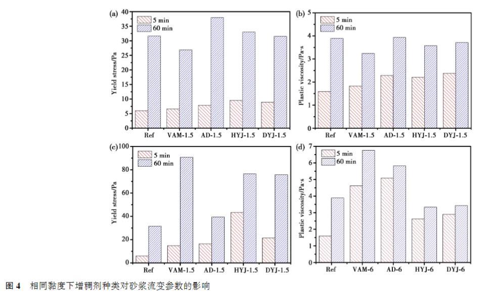 (1)增稠劑的加入顯著降低砂漿的流動度,提高砂漿的屈服應(yīng)力和塑性黏度。