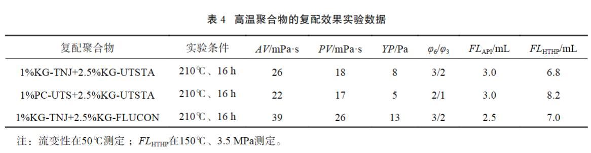 室內(nèi)以濾失改善效果較好的1%DrilFILHT為基礎(chǔ),考察增黏劑KG-TNJ、PC-UTS與2種抗超高溫改性淀粉的復(fù)配效果,選定材料最佳組合。評價配方:基礎(chǔ)配方+1.0%DrilFILHT+復(fù)配聚合物,實驗結(jié)果見表4。