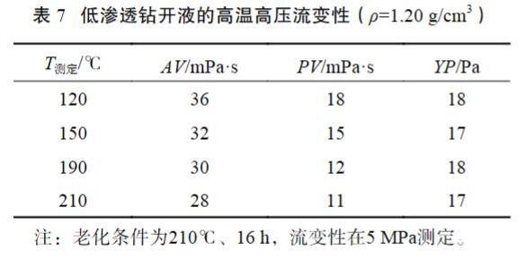 表7低滲透鉆開液的高溫高壓流變性(ρ=1.20 g/cm3)