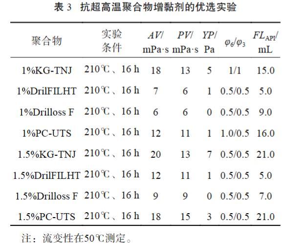 室內(nèi)對4種高溫聚合物增黏劑材料進(jìn)行了單劑抗溫性能對比評價。其中KG-TNJ為溫敏疏水締和聚合物提黏劑,DrilFILHT為納米片狀氧化鎂酚醛樹脂改性聚合物增黏降濾失劑材料,Drilloss F為納米微球聚合物復(fù)合增黏聚合物材料,PC-UTS為某國外代表性高溫聚合物材料。評價配方:基礎(chǔ)配方+2.5%KG-UTSTA+聚合物,實驗結(jié)果見表3。