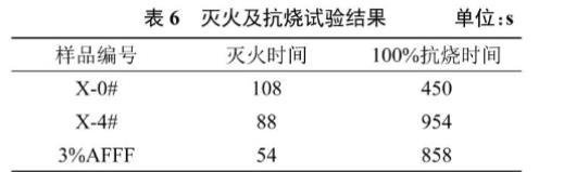 X-4#樣品泡沫具有高泡沫穩(wěn)定性,在以下研究中,著重研究X-4#與X-0#、3%AFFF相比的滅火及抗燒性能,測得的滅火時間及100%抗燒時間見表6。根據(jù)GB 15308—2006規(guī)定,滅火時間小于180 s,抗燒時間高于600s的泡沫被認為具有成為消防泡沫滅火劑的潛力,X-4#樣品滅火時間88s、抗燒時間954 s,抗燒時間優(yōu)于3%AFFF,滅火時間比3%AFFF略高,但滿足消防用泡沫滅火劑性能要求,具有良好的消防滅火應(yīng)用潛力。