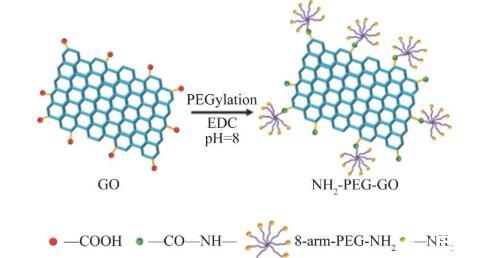NH2-PEG-GO的制備方法:使用8-arm-PEG-NH2對GO表面進行修飾(圖1)。取80 mL上述細胞破碎機處理后的GO溶液,加入16 mL質量濃度為2 mg/mL EDC來活化GO表面羧基,然后將混合溶液在功率為570 W條件下超聲30 min(開1.5 s,關1 s),待分散均勻后,再用5%NaOH溶液來調節(jié)溶液酸堿性(pH=8),隨后將240 mg 8-arm-PEG-NH2加入,超聲反應30 min后,再常溫攪拌反應12 h,離心水洗后得到氨基修飾的GO,于室溫真空冷凍干燥2 d后,得到最終產物,將產物研磨備用。