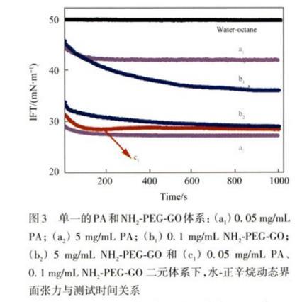 當?shù)唾|量濃度的NH2-PEG-GO與PA共存時,相比于單組分NH2-PEG-GO(0.1 mg/mL)或PA(0.05 mg/mL)能更有效降低界面張力。例如,油相水相分別添加低質量濃度的PA(0.05 mg/mL)與NH2-PEG-GO(0.1 mg/mL),即可實現(xiàn)與單獨添加高質量濃度PA(5 mg/mL)或NH2-PEG-GO(5 mg/mL)相同的效果。并且此時界面張力隨時間變化曲線與單獨添加PA類似,平衡時間在200 s左右。這表明前期的界面張力降低現(xiàn)象主要由PA吸附引起。