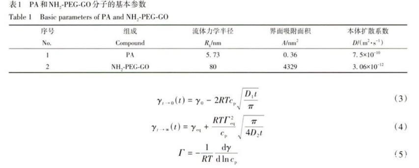 這些吸附解析特征由NH2-PEG-GO和PA的尺寸差異引起。NH2-PEG-GO納米片尺寸相比于PA較大,其在水溶液中擴散系數(shù)D=3.06×10-12 m2/s比PA分子在正辛烷中的擴散系數(shù)小2個數(shù)量級(表1和輔助材料圖S1、圖S2)。因此,PA分子擴散到界面速率快,會優(yōu)先吸附到界面上,PA分子的親水羧基會靠近水相,疏水烷基鏈伸向油相。而當NH2-PEG-GO分子貼近水-油界面時,其親水長鏈PEG-NH2會先接觸界面,然后疏水平面逐漸平行于界面,最終使疏水基面與界面接觸。這種界面取向為GO在界面的最小自由能狀態(tài),能夠大面積地覆蓋水-油界面。