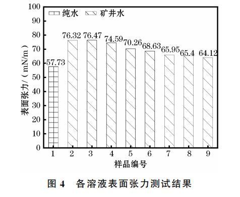 由圖4可知,純水、礦井水1#至4#、礦井水5#至8#表面張力平均值分別為57.73 mN/m、74.41 mN/m、66.03mN/m,純水表面張力明顯小于礦井水,隨著礦井水中Na+、K+數(shù)目減少,其表面張力顯著減弱。這是由于礦井水中Na+、K+離子濃度減小,靜電力吸附有效范圍擴大,吸附作用隨之增強,直至界面對離子的吸附作用逐漸大于排斥作用,因此表面張力呈現(xiàn)減小趨勢。由此可知,低離子濃度條件下,礦井水表面張力與其Na+、K+離子濃度呈正相關(guān)。在相同壓力條件下,表面張力決定霧滴粒徑分布,因此,純水噴霧霧化特性略優(yōu)于礦井水。綜上,礦井水中Na+、K+等離子濃度通過改變其表面張力間接影響噴霧霧化特性。針對煤礦井下粉塵治理,可將降塵用水進行軟化除鹽處理后應(yīng)用于噴霧降塵,以期降低其表面張力,優(yōu)化噴霧霧化特性。