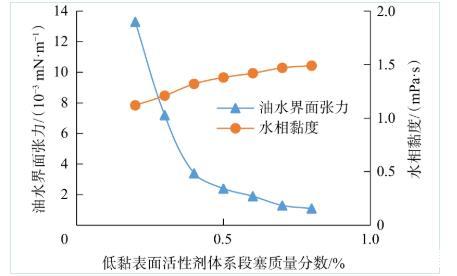 圖1 OBU-3低黏表面活性劑體系含量對(duì)界面張力和水相黏度的影響