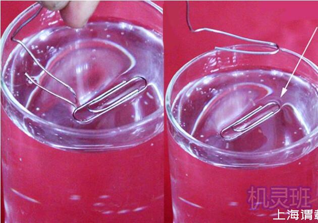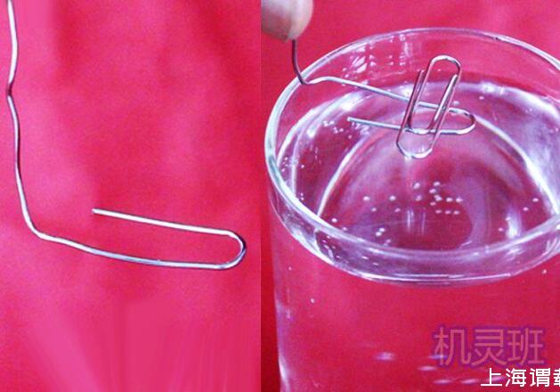 3、現(xiàn)在,將步驟2的整體回形針?biāo)降芈刭N近水面,再輕輕抽走作為支架的回形針,則你會發(fā)現(xiàn)回形針漂浮在水面上。
