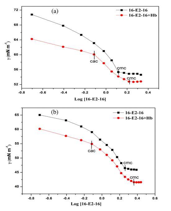 表面張力測(cè)量用于研究 關(guān)于 16-E2-16/Hb 相互作用的定性信息 空氣/水界面。 圖 1 顯示了 16-E2-16 分布的表面張力與對(duì)數(shù)濃度在不存在和 在不同溫度下存在 Hb (5 μM)。 斷點(diǎn) 表面張力與表面活性劑濃度對(duì)數(shù)的關(guān)系 不同溫度下純表面活性劑的文件對(duì)應(yīng) 到相應(yīng)溫度下表面活性劑的 cmc。 這 16-E2-16/Hb體系的表面張力曲線呈現(xiàn)兩個(gè)斷裂 點(diǎn),第一個(gè)斷點(diǎn)對(duì)應(yīng)臨界聚合 濃度(cac)代表表面活性劑的開始 蛋白質(zhì)結(jié)合而作為第二個(gè)斷點(diǎn)對(duì)應(yīng)于 在 Hb 存在下 16-E2-16 的 cmc。 16-E2-16 的 cmc 在不同溫度下不存在和存在 Hb 的情況下 列在表 1 中。從這些值可以看出,16-E2-16 的 cmc 隨著 Hb 的存在和溫度升高而增加。 在 Hb 存在下 cmc 的增加證實(shí)了 16-E2-16/Hb 復(fù)合物的形成,在此期間一些單體 與 Hb 結(jié)合,因此無法形成膠束 進(jìn)而導(dǎo)致膠束化延遲 [54]。 表1還 表明 cmc 值隨溫度升高而增加 這意味著疏水力的參與,它們是 溫度依賴,在 cmc 的蛋白質(zhì)表面活性劑相互作用中。 這可以歸因于 16-E2-的溶解度增加 16 單體隨溫度變化而抑制膠束化。 此外,較高的溫度有利于熱運(yùn)動(dòng),這會(huì)導(dǎo)致 更多的分子與 Hb 結(jié)合。 但是,cac 保持不變 在所有溫度下。 因此,我們可以認(rèn)為 16-E2-16 與 Hb 結(jié)合 通過 cac 附近的靜電相互作用,因?yàn)殪o電 相互作用不受溫度影響。 此后,作為 表面活性劑濃度增加,蛋白質(zhì)通過疏水力與表面活性劑相互作用。 下表面張力值 Hb-16-E2-16系統(tǒng)比對(duì)應(yīng)的16-E2-16系統(tǒng)是 由于 Hb 的高表面活性。