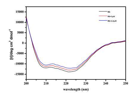 進(jìn)行CD以進(jìn)一步確認(rèn)構(gòu)象變化 由 16-E2-16 引起的 Hb,從而允許進(jìn)一步評(píng)估 Hb 和 16-E2-16 之間的相互作用。 圖 5 顯示了 不存在和存在 16-E2-16 時(shí) Hb 的 CD 光譜。 光盤 Hb 的光譜在 208 nm 和 222 nm 處顯示兩個(gè)負(fù)最小值, 蛋白質(zhì)α-螺旋結(jié)構(gòu)的特征。 16-E2-16 光學(xué)不活動(dòng)不顯示任何信號(hào)。 在場(chǎng) 在 16-E2-16 中,Hb 的負(fù)橢圓度降低,表明 可能形成 Hb/16-E2-16 復(fù)合物 [68]。 α-螺旋 計(jì)算了 Hb 及其與 16-E2-16 (2 μM) 復(fù)合物的百分比,發(fā)現(xiàn)分別為 53% 和 47%。 進(jìn)一步降低 在更高濃度的 16-E2-16 (2.5 μM) 存在下達(dá)到 44% 表明 Hb 的 α-螺旋含量明顯降低。 因此, CD 結(jié)果表明存在 16-E2-16 變化 Hb 的二級(jí)結(jié)構(gòu)與我們的 計(jì)算結(jié)果。