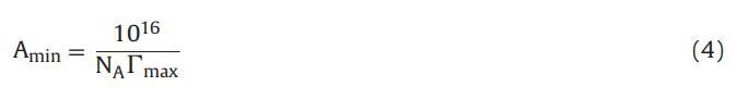 其中 γ 是表面活性劑濃度 C 下的平衡表面張力 (mNm?1),n 是每分子的粒子數(shù) 表面活性劑。 由于表面活性劑的解離導(dǎo)致三種物質(zhì)的形成,公式 1111 表示在低于 cmc 的恒定溫度下 γ 與 log[16-E2-16] 之間的曲線斜率。 ∫max 值允許計(jì)算 每個(gè)分子 Amin 的最小表面積(以 nm2 為單位) 方程: