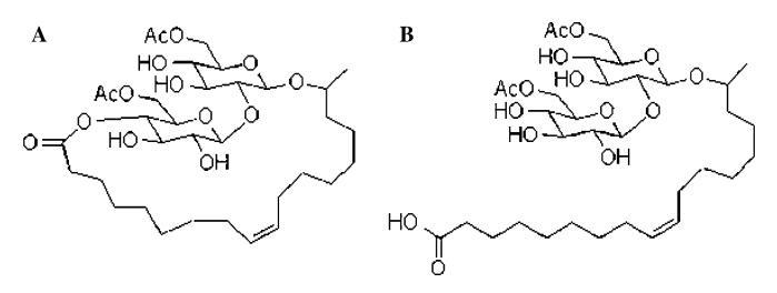 通常,槐糖的60-和600-羥基被乙?;舅徭滈L度在16到18個碳之間變化(一個例外是由R.bogoriensis合成的SLs,其中包括22和24個碳的脂肪酸側(cè)鏈;Nun?ez et al.2004); 并且可能是飽和的或不飽和的。 此外,SLs的優(yōu)選結(jié)構(gòu)構(gòu)象為內(nèi)酯,其中脂肪酸的羧基在碳400處酯化為二糖環(huán),盡管在某些情況下,SLs的脂肪酸可能保持游離酸、開鏈形式。